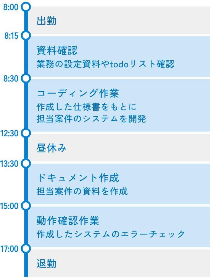 当社では、ただコードを書くのではなく仕様の理解からお客様対応、資料作成まで幅広い力が求められます。