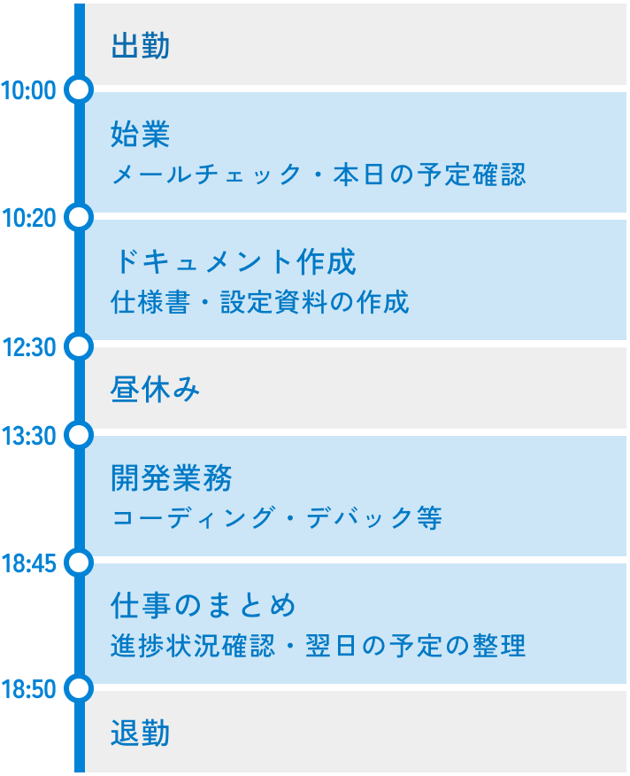出社時間に応じて退勤時間も変わりますが、作業が順調な時や、私用がある場合などは15時や16時に退勤する日もあります。