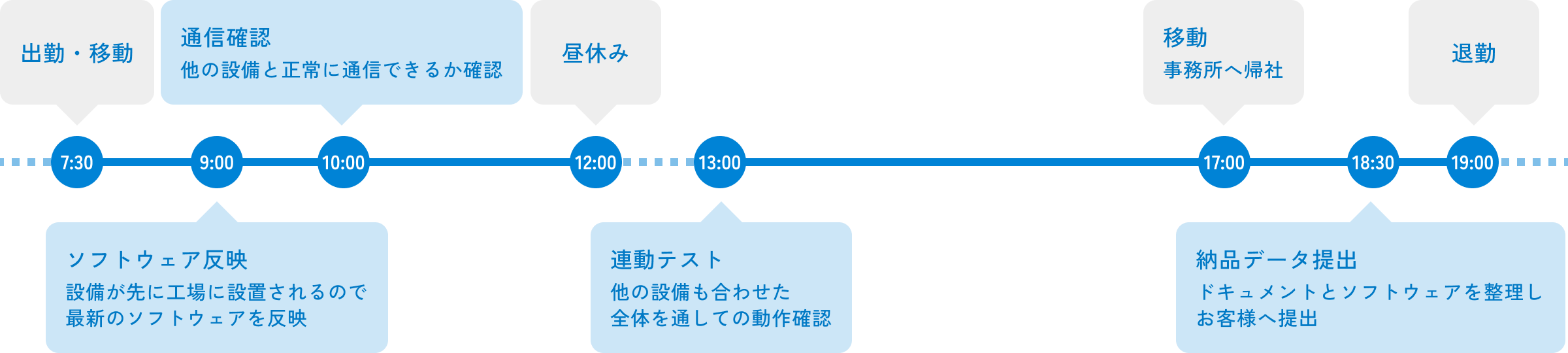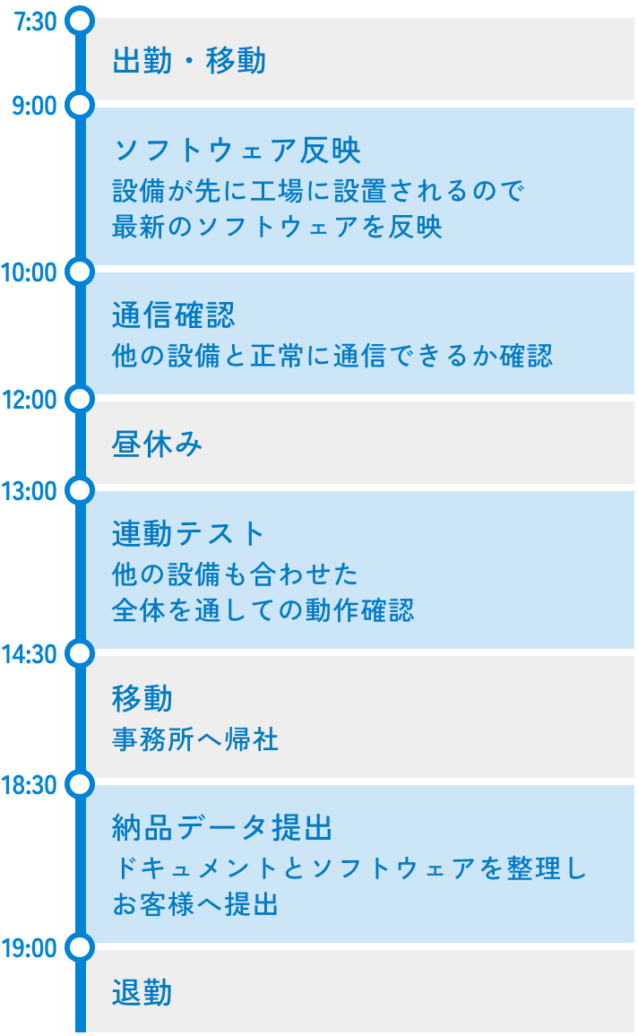 当社の製品は、工場の他の設備と情報をやり取りするものが多いです。工場での通信確認や連動テストではそれらの設備と正常に通信できているかを確認します。