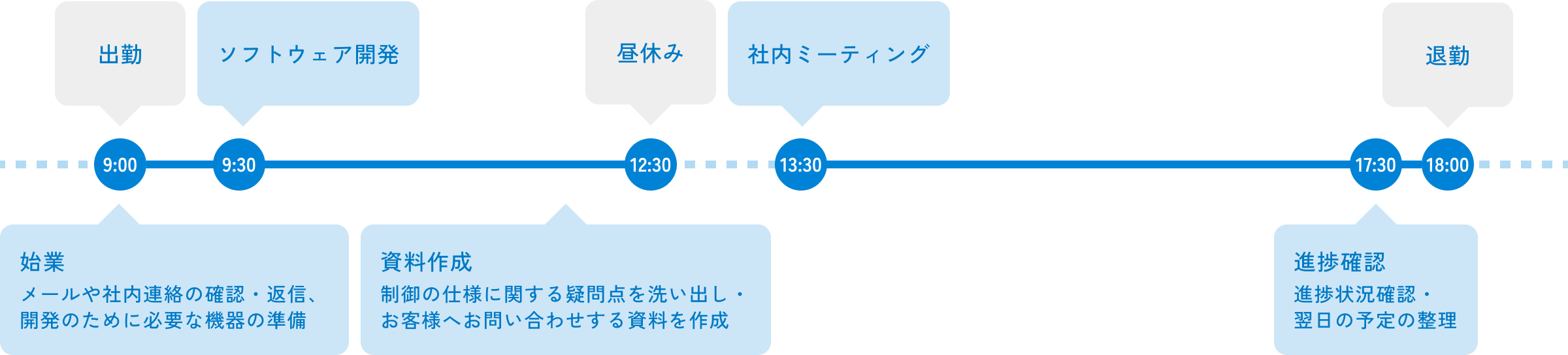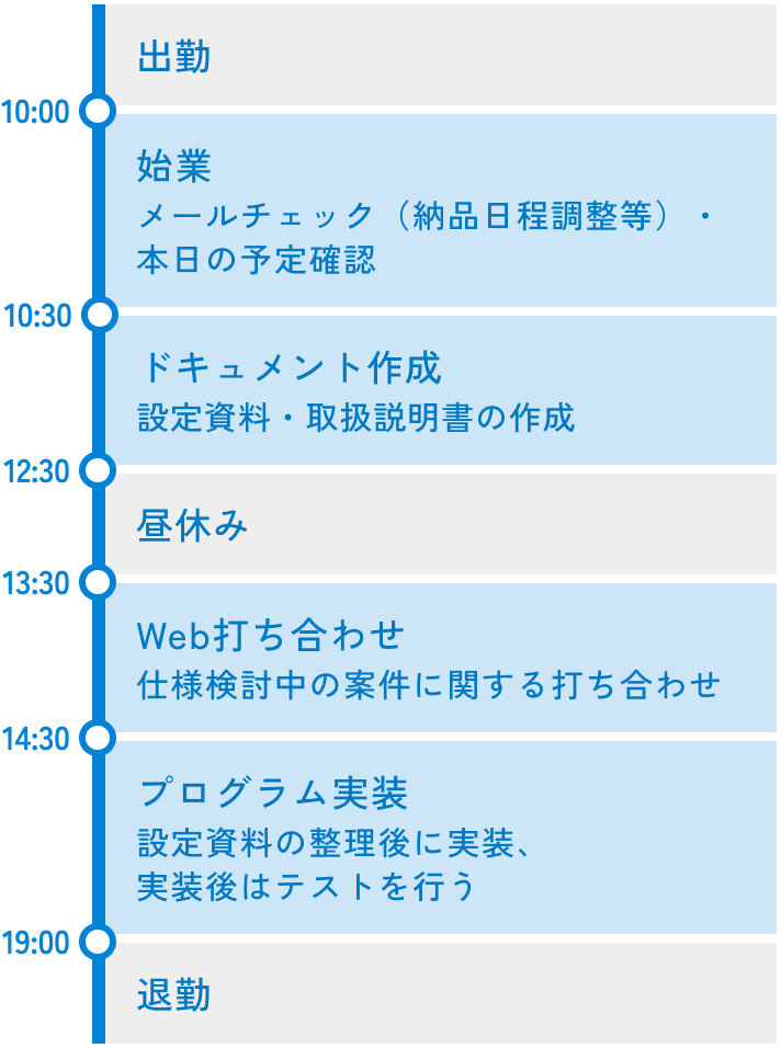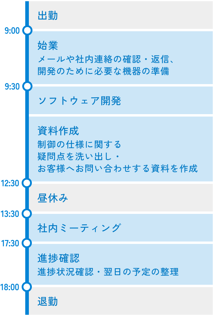 午前中に担当している案件のソフトウェア開発を行います。PLCやタッチパネルなど実機を使用して開発をします。